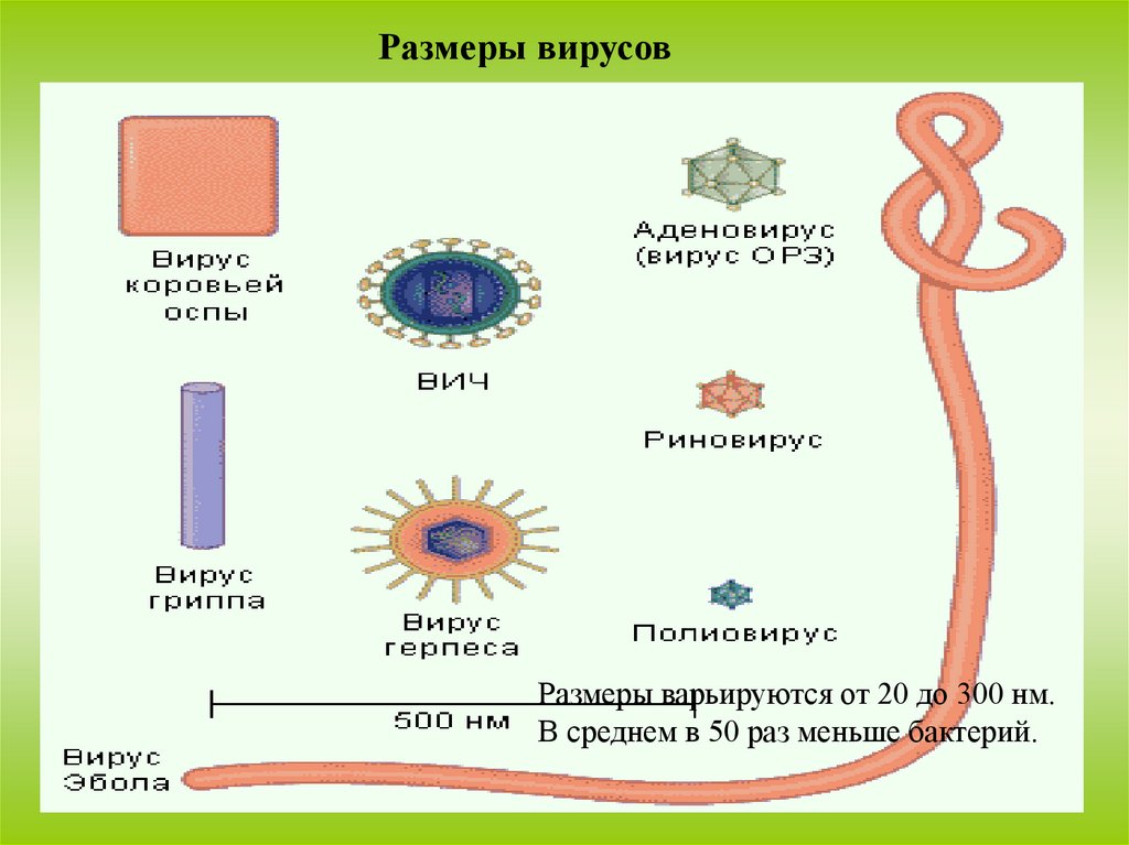 Размеры вирусовРазмеры варьируются от 20 до 300 нм.