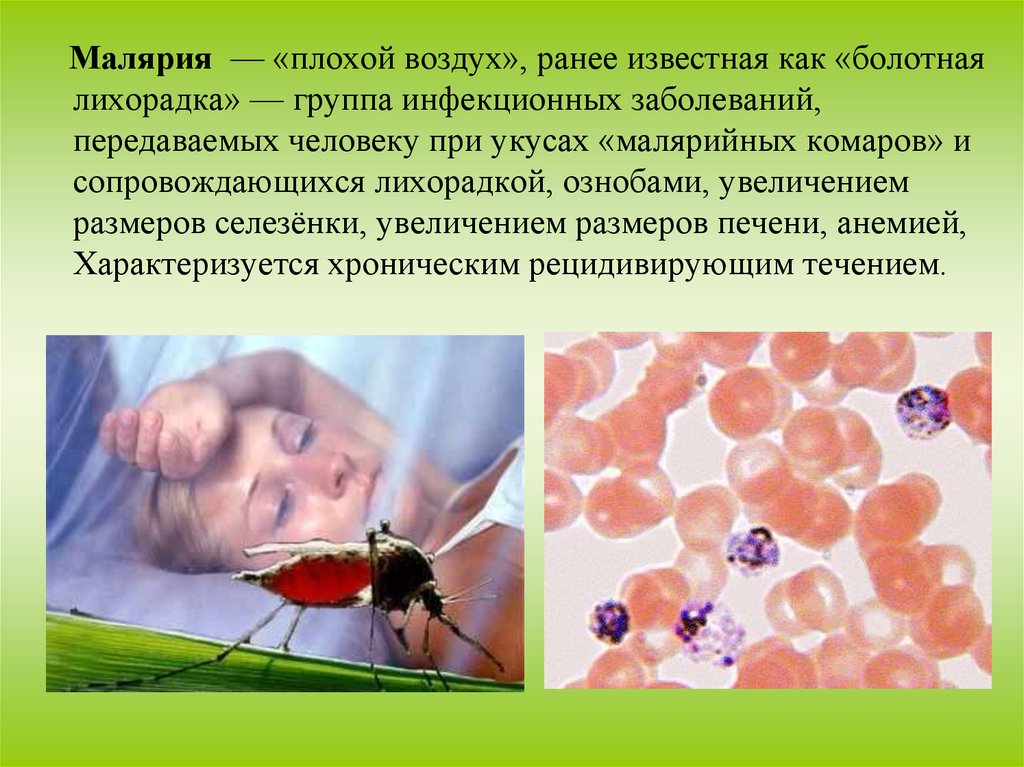 Малярия — «плохой воздух», ранее известная как «болотнаялихорадка» — группа инфекционных заболеваний,