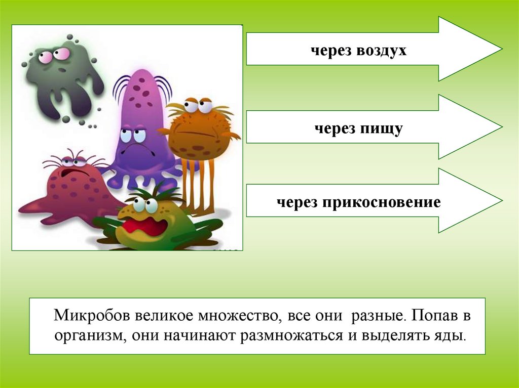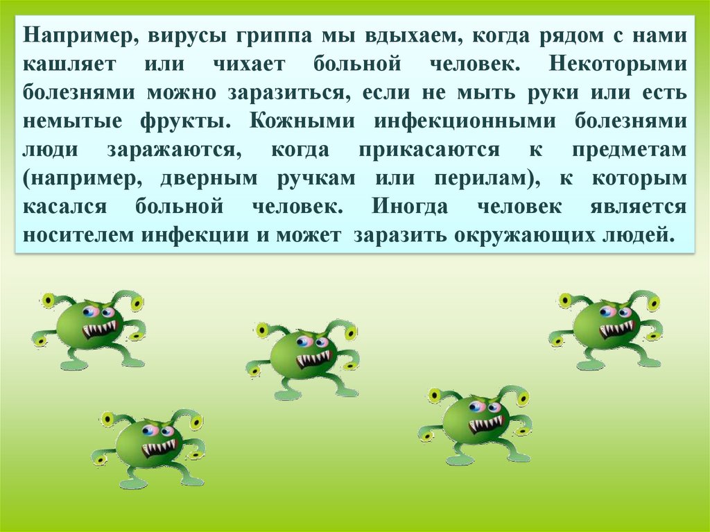 Например, вирусы гриппа мы вдыхаем, когда рядом с намикашляет или чихает больной человек. Некоторыми