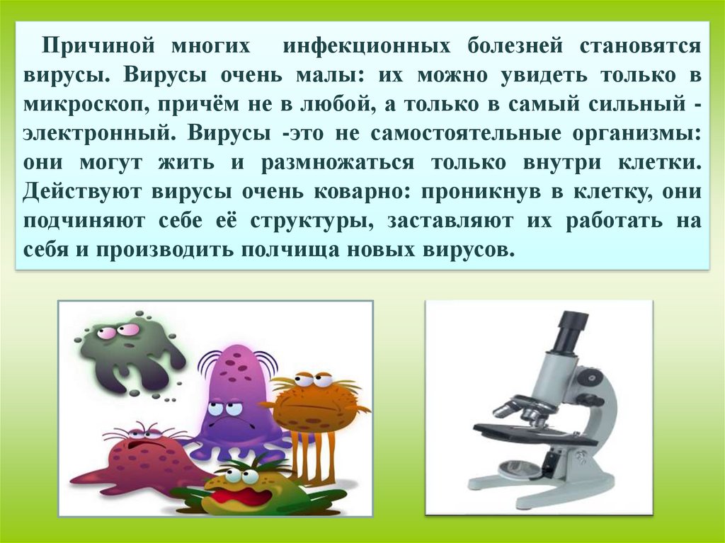 Причиной многих инфекционных болезней становятсявирусы. Вирусы очень малы: их можно увидеть только в