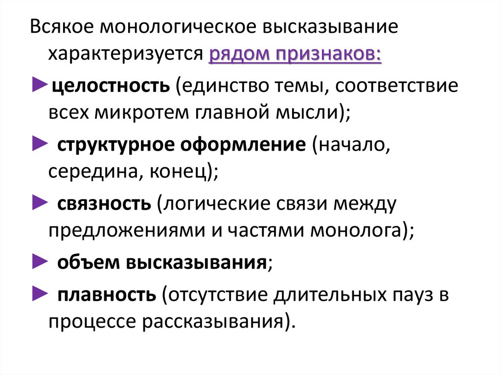 Всякое монологическое высказываниехарактеризуется рядом признаков: