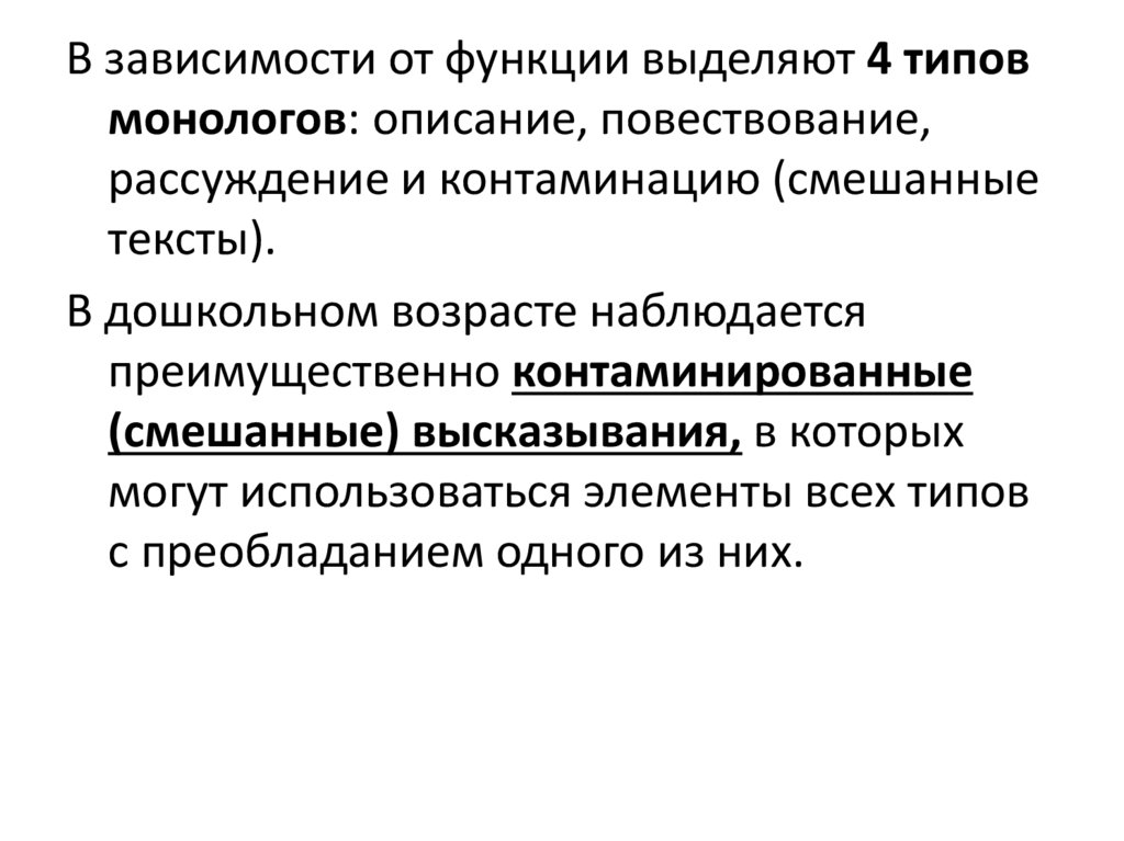 В зависимости от функции выделяют 4 типовмонологов: описание, повествование,