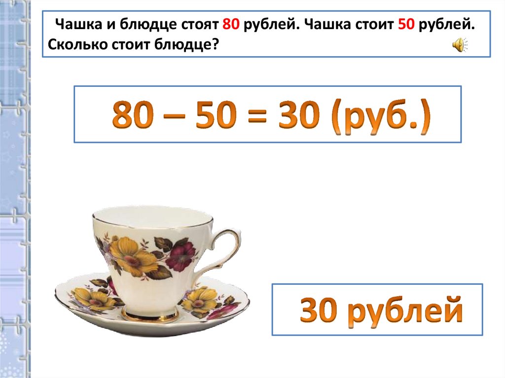 Чашка и блюдце стоят 80 рублей. Чашка стоит 50 рублей.Сколько стоит блюдце?