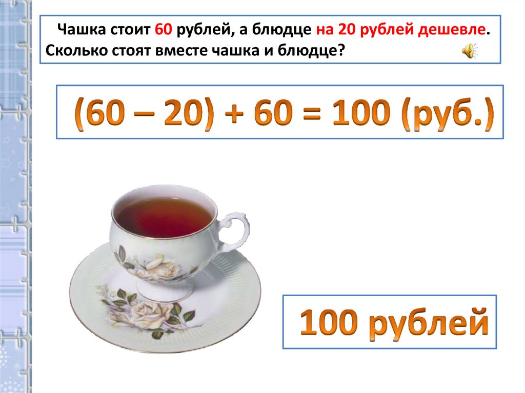 Чашка стоит 60 рублей, а блюдце на 20 рублей дешевле.Сколько стоят вместе чашка и блюдце?