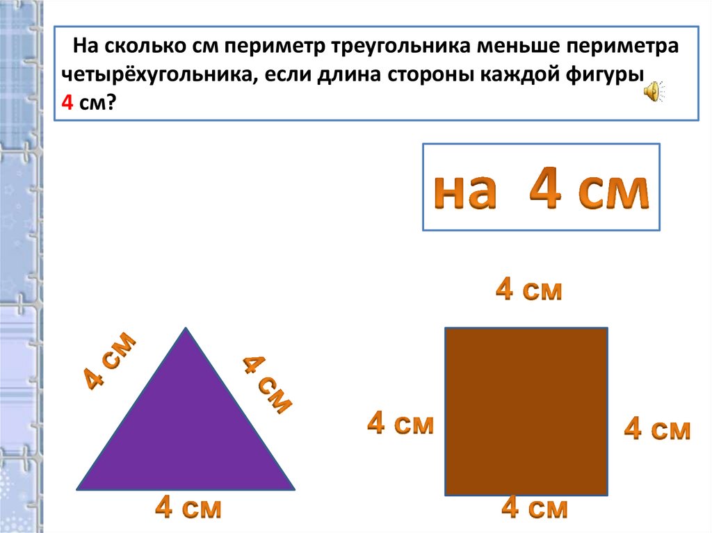 На сколько см периметр треугольника меньше периметрачетырёхугольника, если длина стороны каждой фигуры