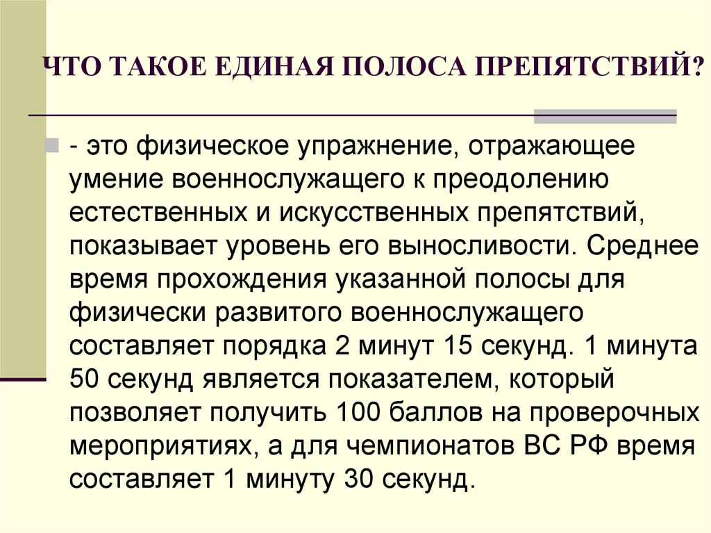 ЧТО ТАКОЕ ЕДИНАЯ ПОЛОСА ПРЕПЯТСТВИЙ?- это физическое упражнение, отражающее