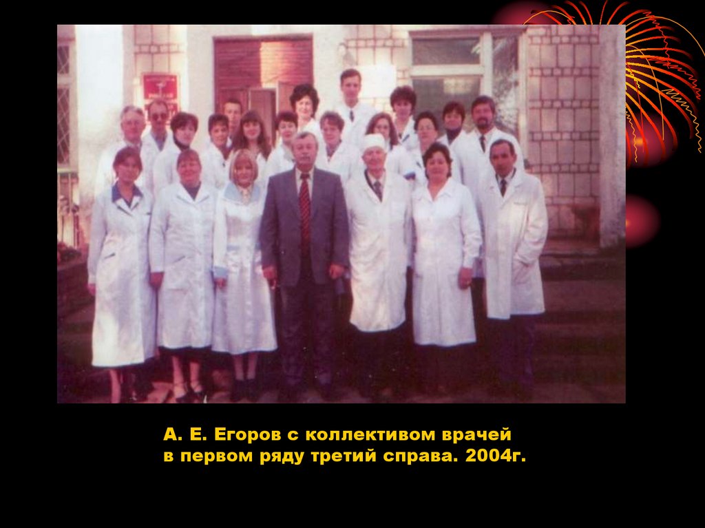 А. Е. Егоров с коллективом врачейв первом ряду третий справа. 2004г.