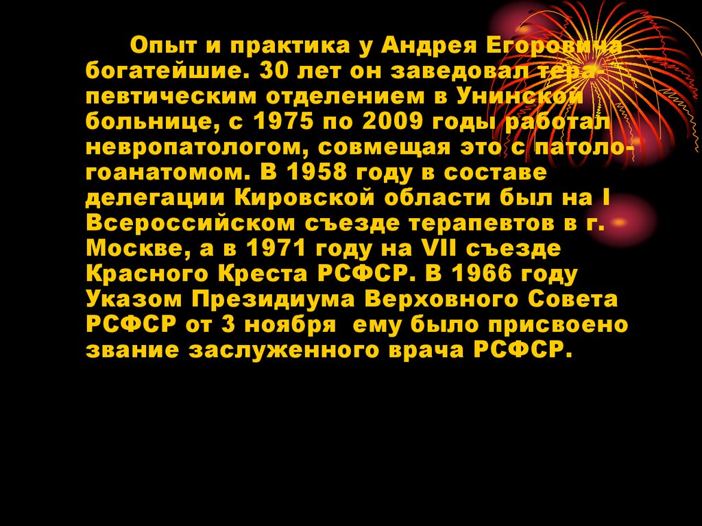 Опыт и практика у Андрея Егоровичабогатейшие. 30 лет он заведовал терапевтическим отделением в Унинской