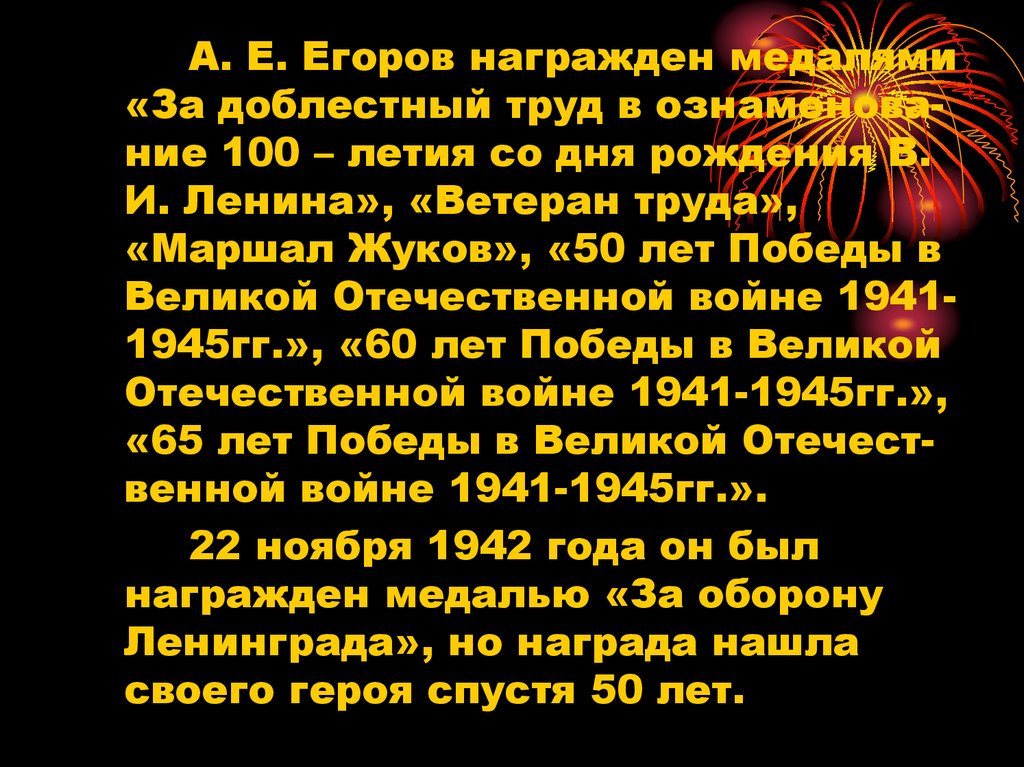 А. Е. Егоров награжден медалями«За доблестный труд в ознаменование 100 – летия со дня рождения В.
