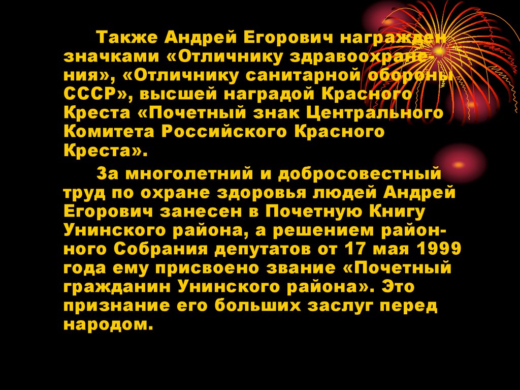 Также Андрей Егорович награждензначками «Отличнику здравоохранения», «Отличнику санитарной обороны