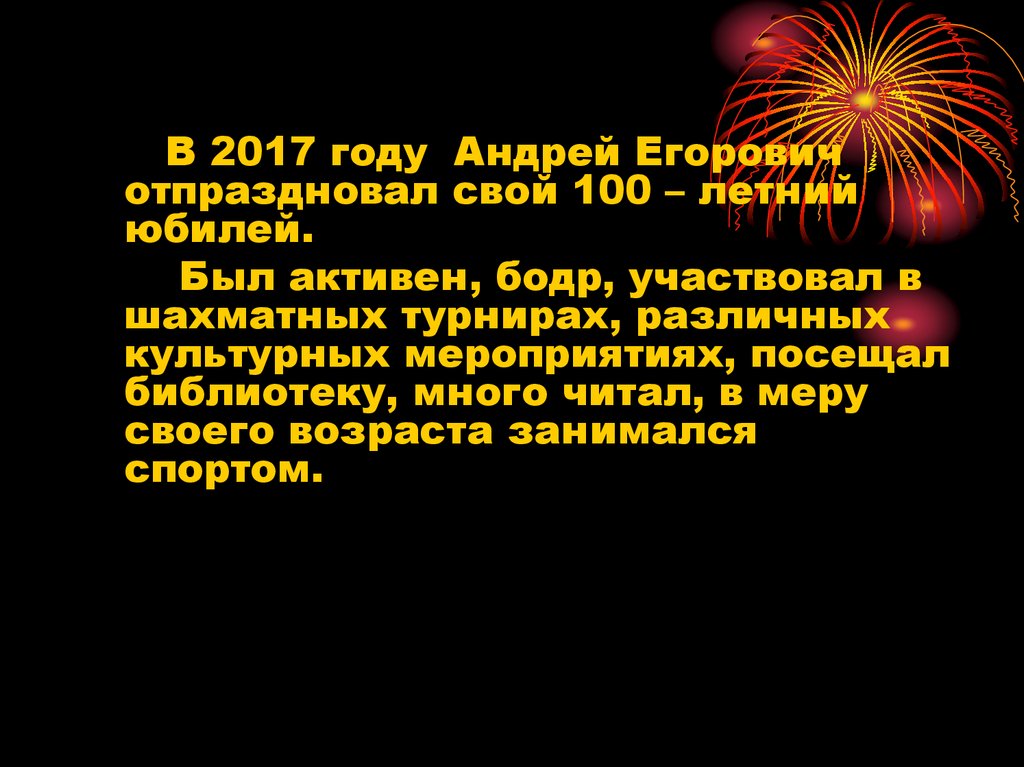 В 2017 году Андрей Егоровичотпраздновал свой 100 – летний