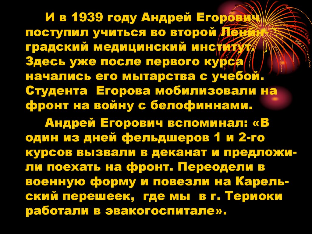 И в 1939 году Андрей Егоровичпоступил учиться во второй Ленинградский медицинский институт.