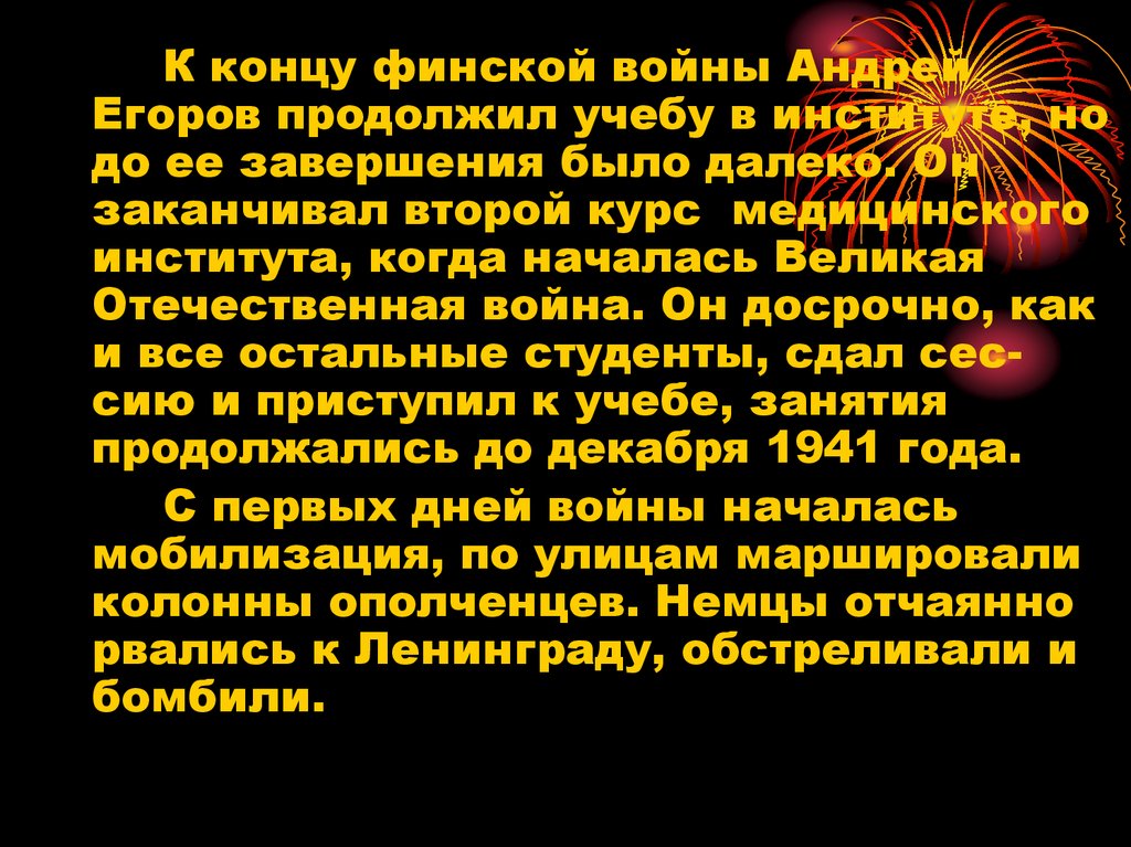 К концу финской войны АндрейЕгоров продолжил учебу в институте, но