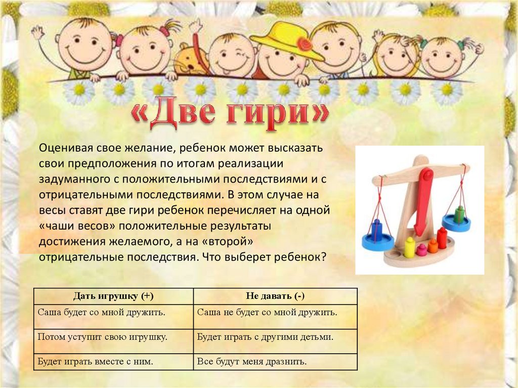 Оценивая свое желание, ребенок может высказатьсвои предположения по итогам реализации