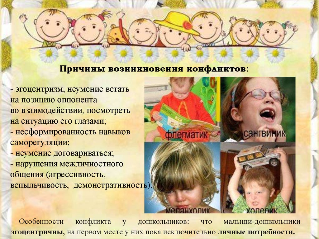 Причины возникновения конфликтов:- эгоцентризм, неумение встать