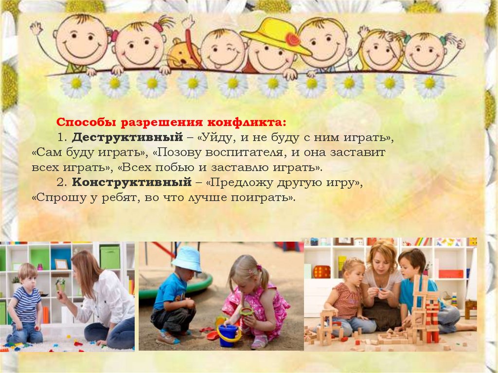 Способы разрешения конфликта:1. Деструктивный – «Уйду, и не буду с ним играть»,