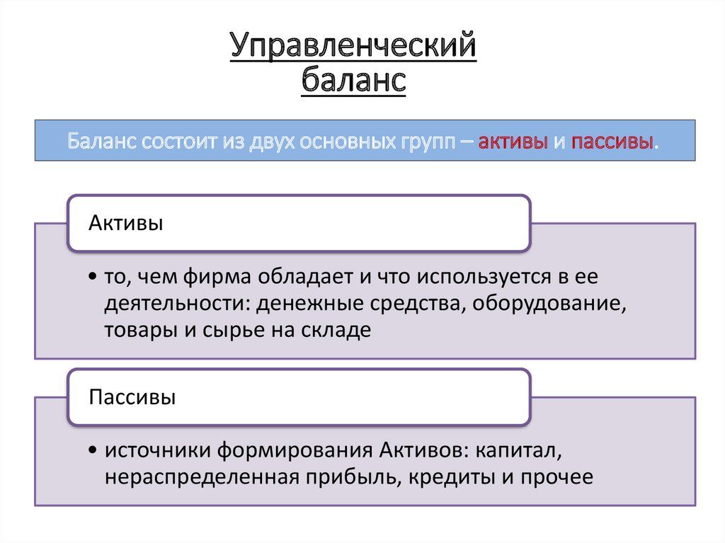 Баланс состоит из двух основных групп – активы и пассивы.