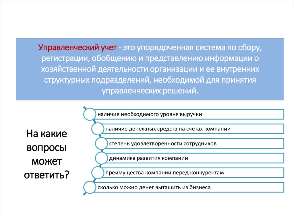 Управленческий учёт — упорядоченная система выявления,измерения, сбора, регистрации, интерпретации, обобщения,