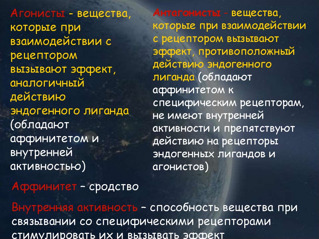 Аффиность(сродство) – способность вещества связываться срецептором.