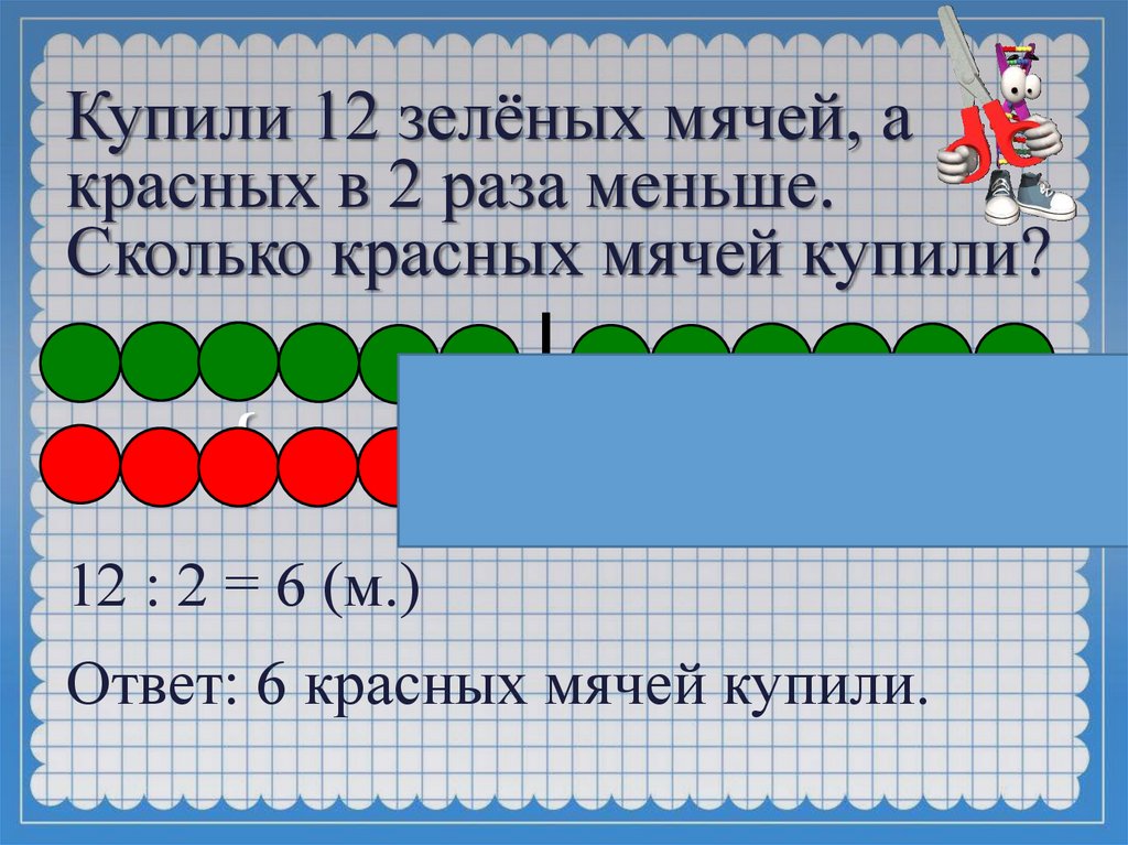 Купили 12 зелёных мячей, акрасных в 2 раза меньше.