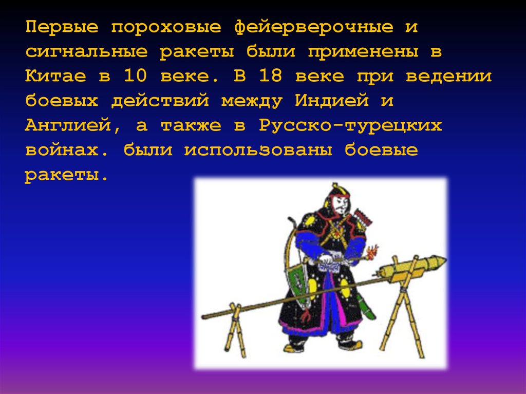 Первые пороховые фейерверочные исигнальные ракеты были применены в