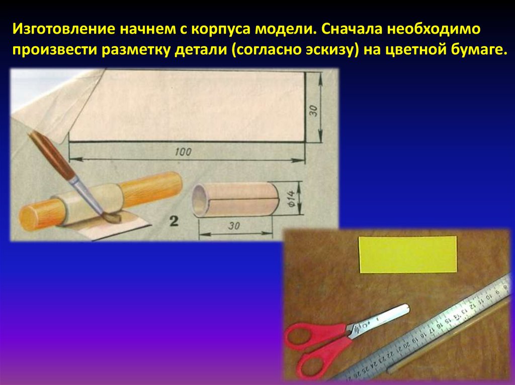 Изготовление начнем с корпуса модели. Сначала необходимопроизвести разметку детали (согласно эскизу) на цветной бумаге.