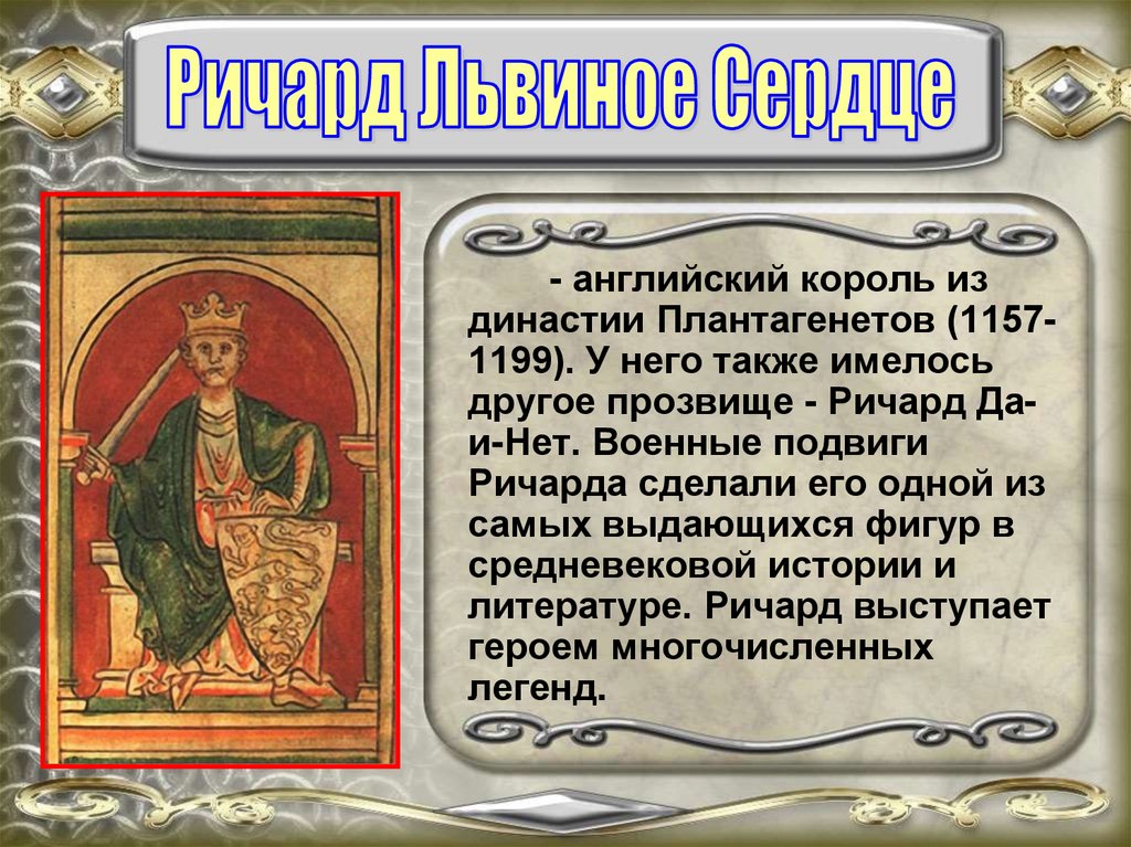 - английский король издинастии Плантагенетов (11571199). У него также имелось