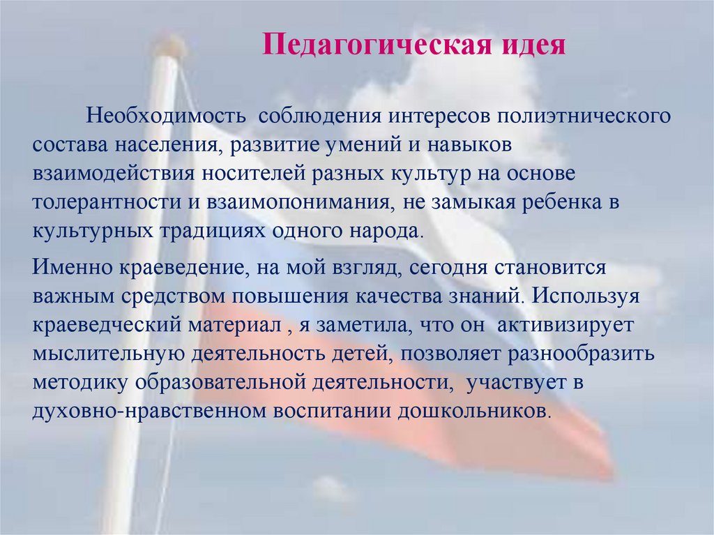 Педагогическая идеяНеобходимость соблюдения интересов полиэтнического