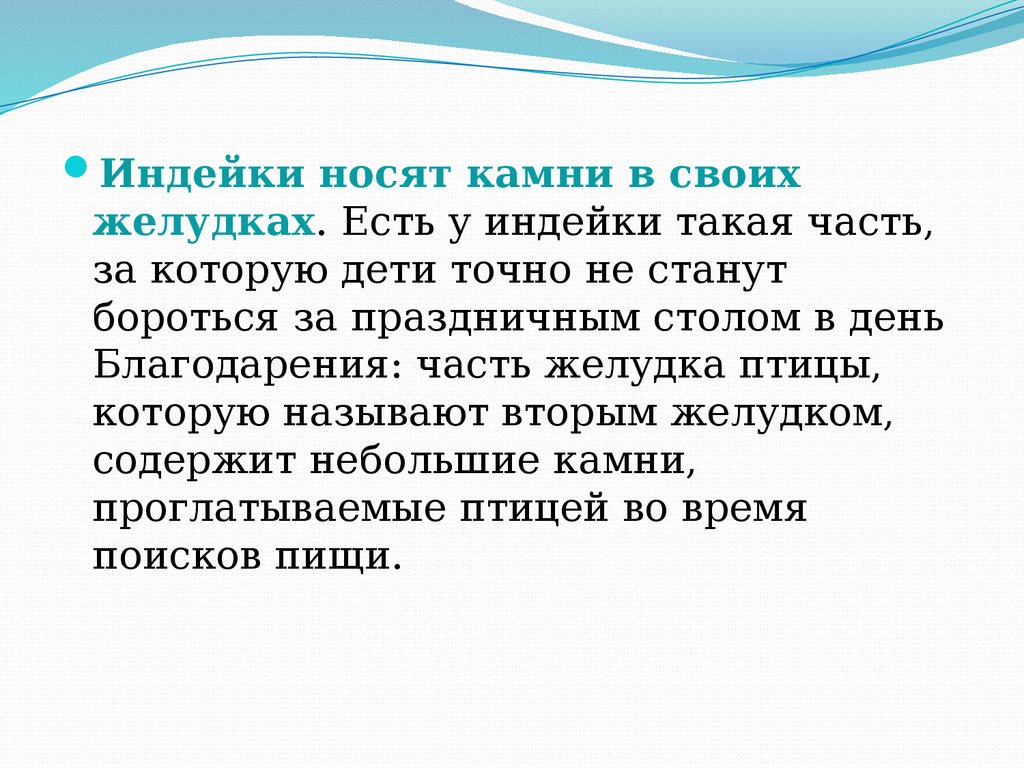 Индейки носят камни в своихжелудках. Есть у индейки такая часть,