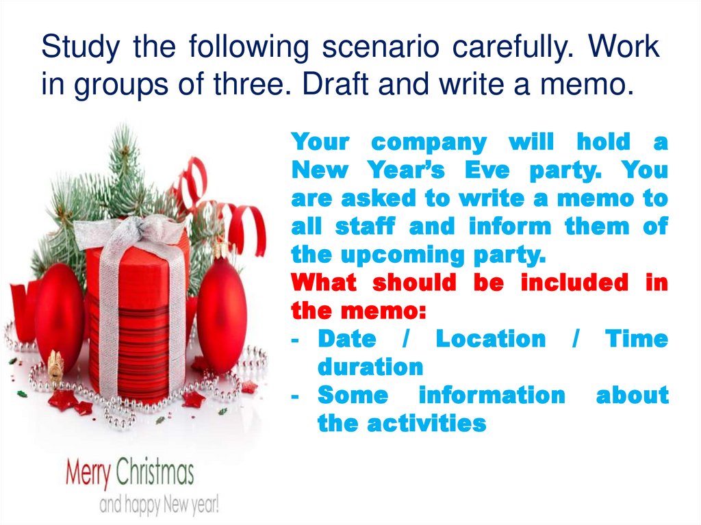 Study the following scenario carefully. Workin groups of three. Draft and write a memo.