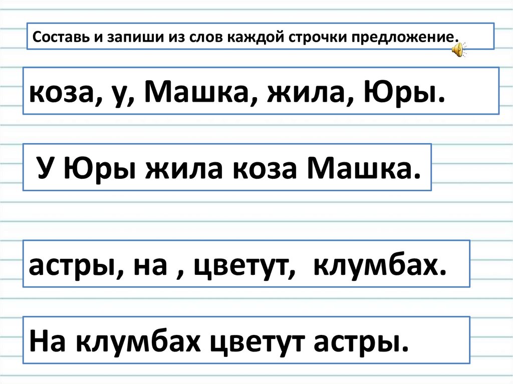 Составь и запиши из слов каждой строчки предложение.коза, у, Машка, жила, Юры.