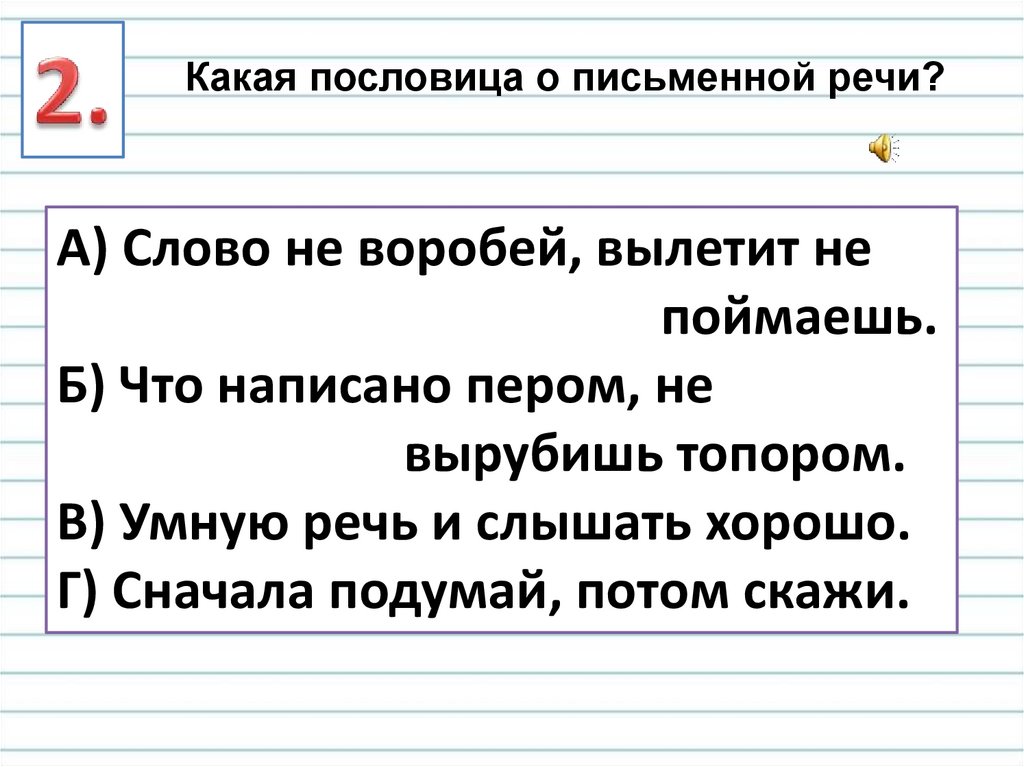 Какая пословица о письменной речи?А) Слово не воробей, вылетит не
