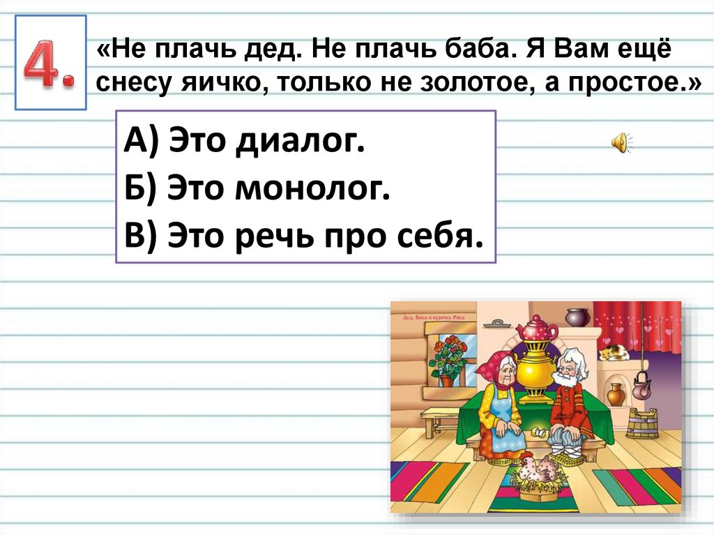 «Не плачь дед. Не плачь баба. Я Вам ещёснесу яичко, только не золотое, а простое.»