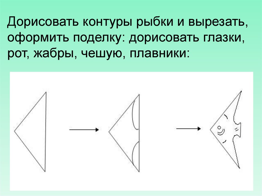 Дорисовать контуры рыбки и вырезать,оформить поделку: дорисовать глазки,
