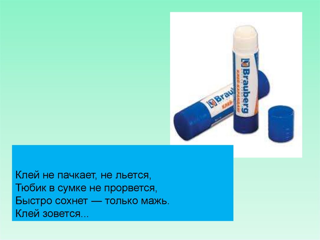 Клей не пачкает, не льется,Тюбик в сумке не прорвется,