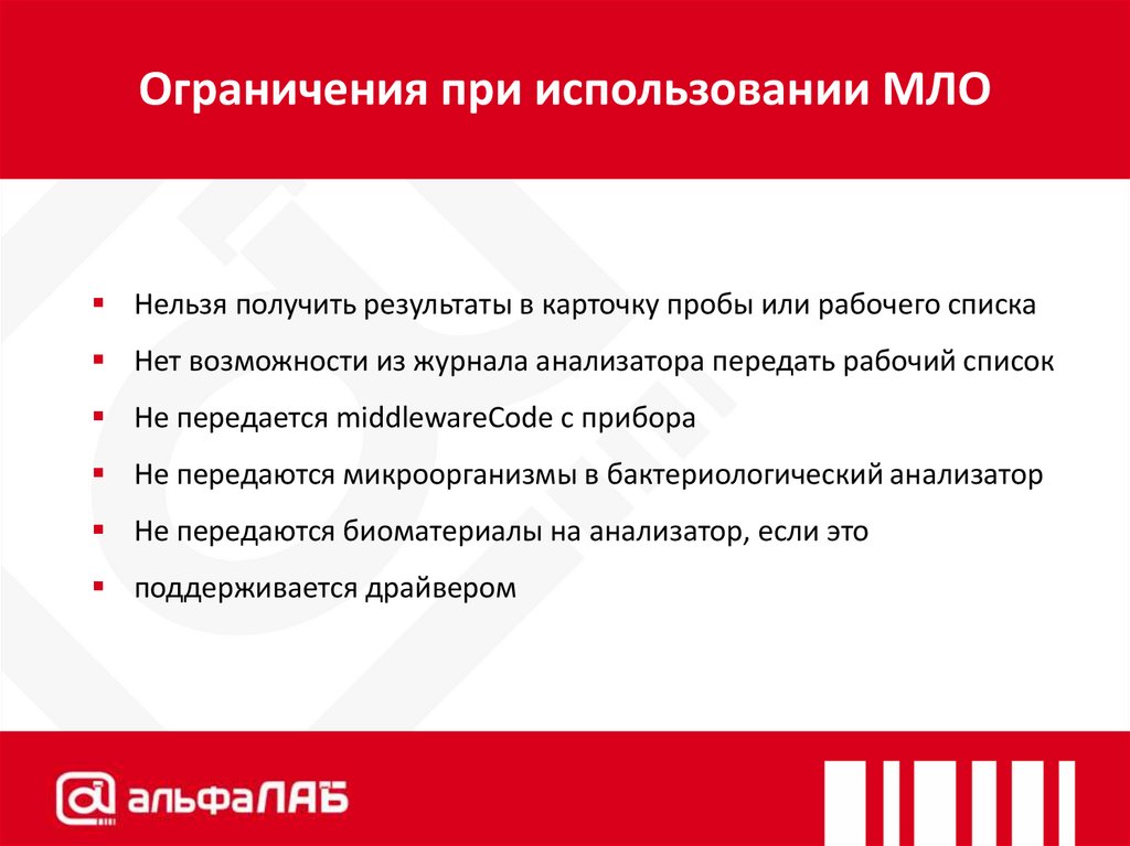 Ограничения при использовании МЛОНельзя получить результаты в карточку пробы или рабочего списка
