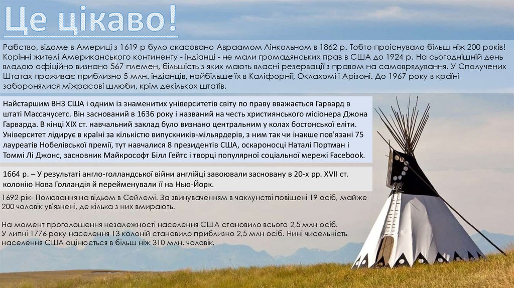 Рабство, відоме в Америці з 1619 р було скасовано Авраамом Лінкольном в 1862 р. Тобто проіснувало більш ніж 200 років!Корінні жителі Американського континенту - індіанці - не мали громадянських прав в США до 1924 р. На сьогоднішній день
