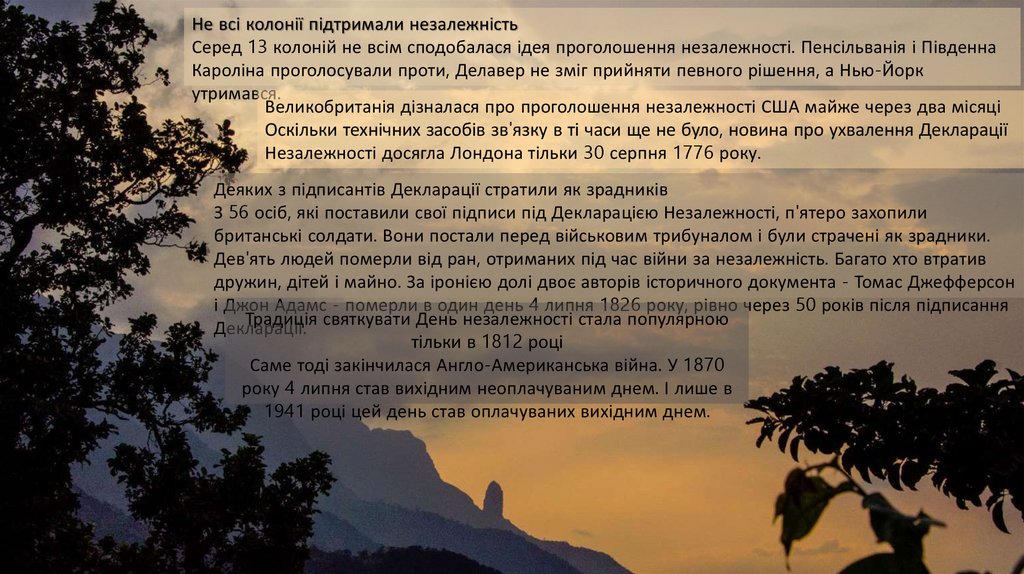 Не всі колонії підтримали незалежністьСеред 13 колоній не всім сподобалася ідея проголошення незалежності. Пенсільванія і Південна