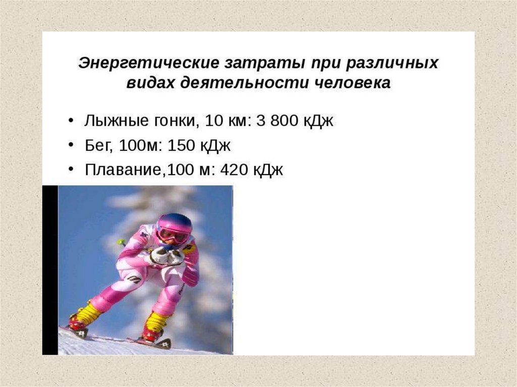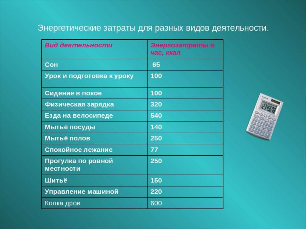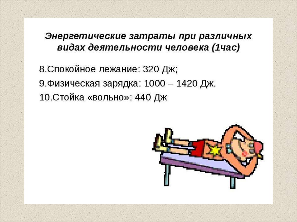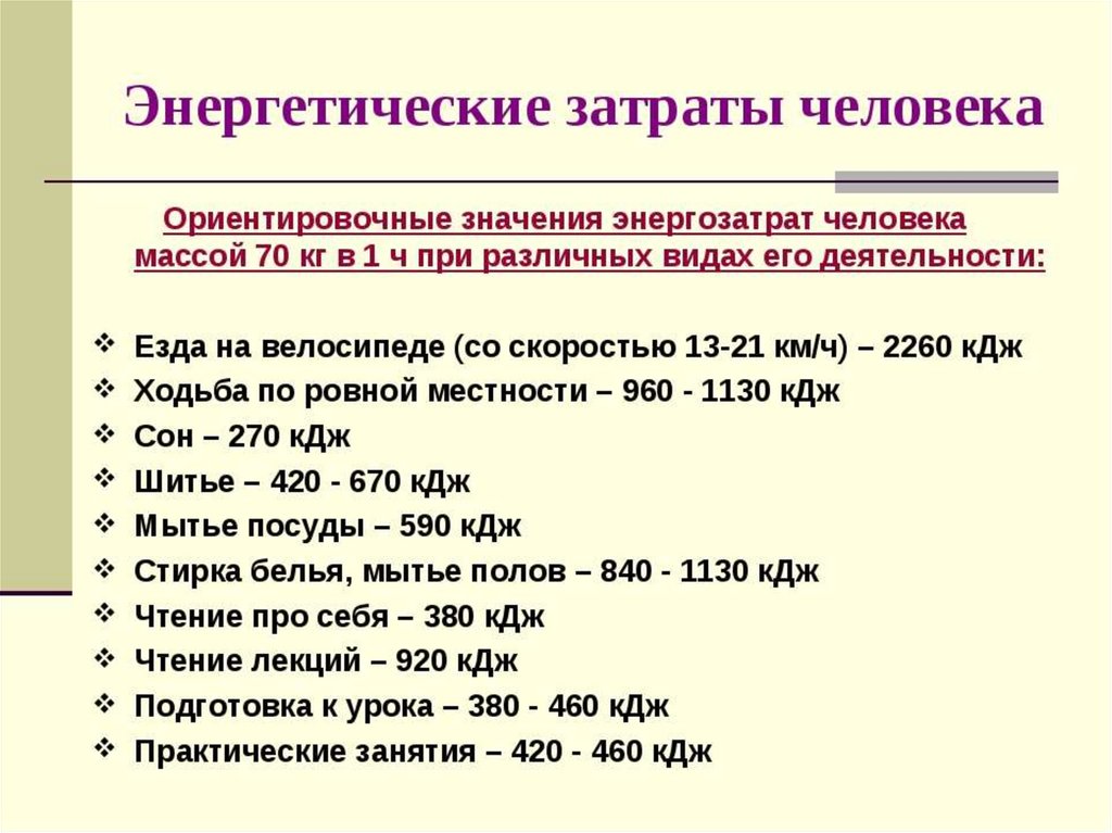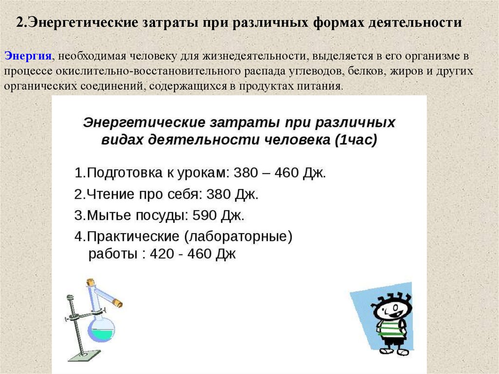 2.Энергетические затраты при различных формах деятельностиЭнергия, необходимая человеку для жизнедеятельности, выделяется в его организме в