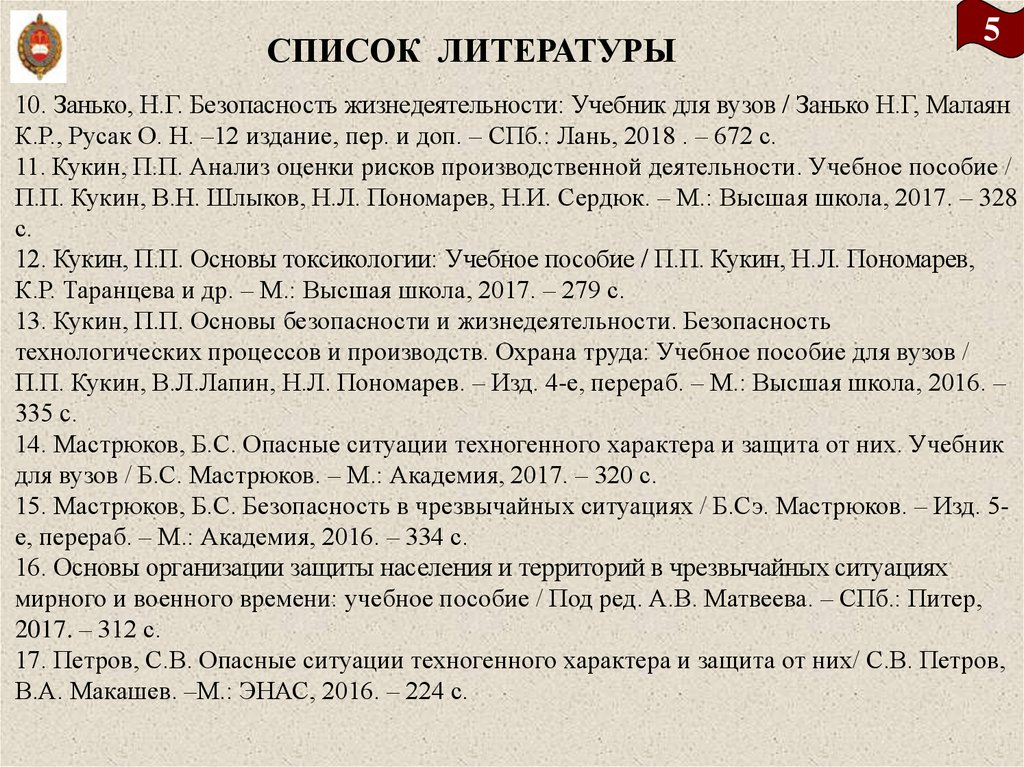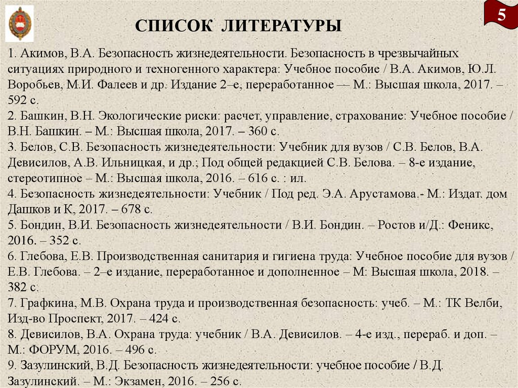 5. Бондин, В.И. Безопасность жизнедеятельности / В.И. Бондин. – Ростов и/Д.: Феникс,
