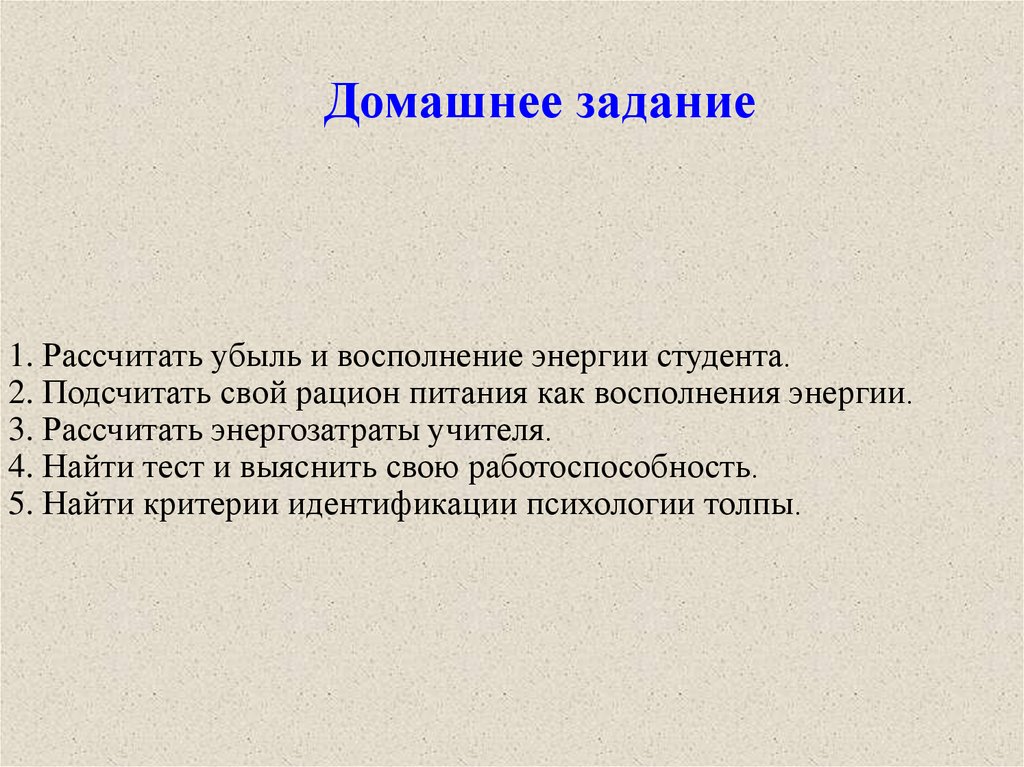 Домашнее задание1. Рассчитать убыль и восполнение энергии студента.