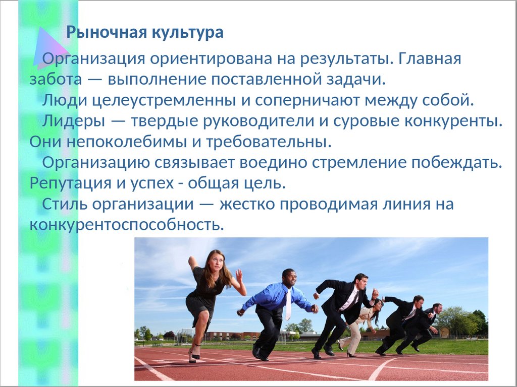 Рыночная культураОрганизация ориентирована на результаты. Главная