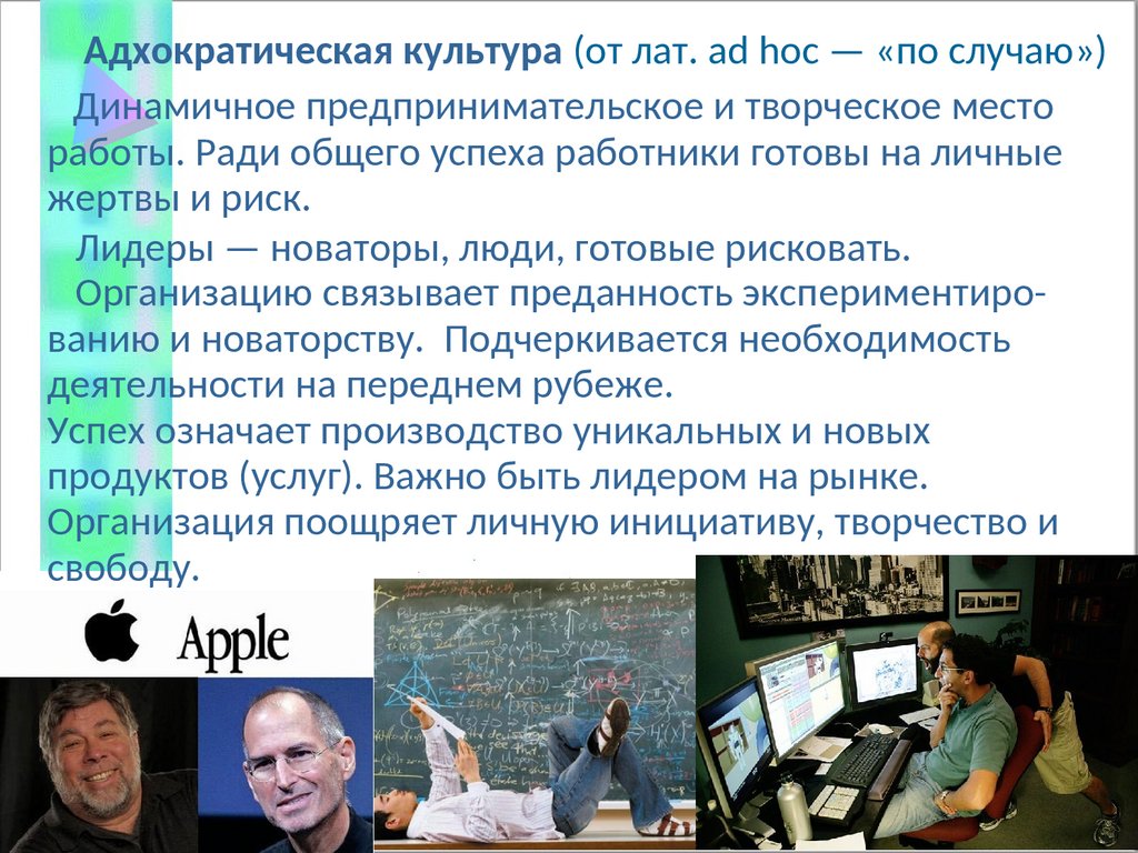 Адхократическая культура (от лат. ad hoc — «по случаю»)по случаю»))Динамичное предпринимательское и творческое место