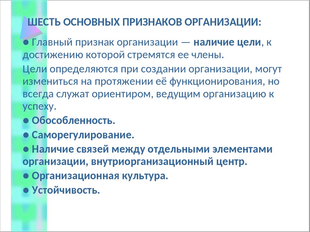 ШЕСТЬ ОСНОВНЫХ ПРИЗНАКОВ ОРГАНИЗАЦИИ:● Главный признак организации — наличие цели, к