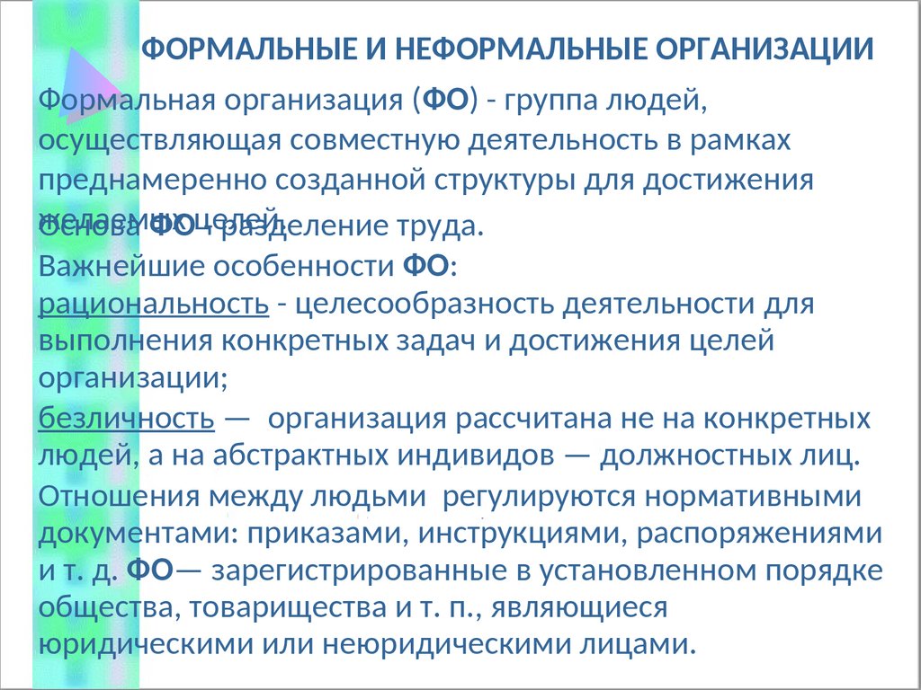 ФОРМАЛЬНЫЕ И НЕФОРМАЛЬНЫЕ ОРГАНИЗАЦИИФормальная организация (ФО) - группа людей,