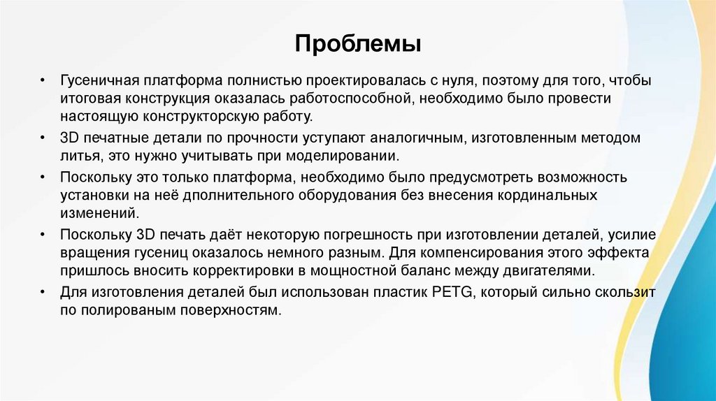 Проблемы• Гусеничная платформа полнистью проектировалась с нуля, поэтому для того, чтобы
