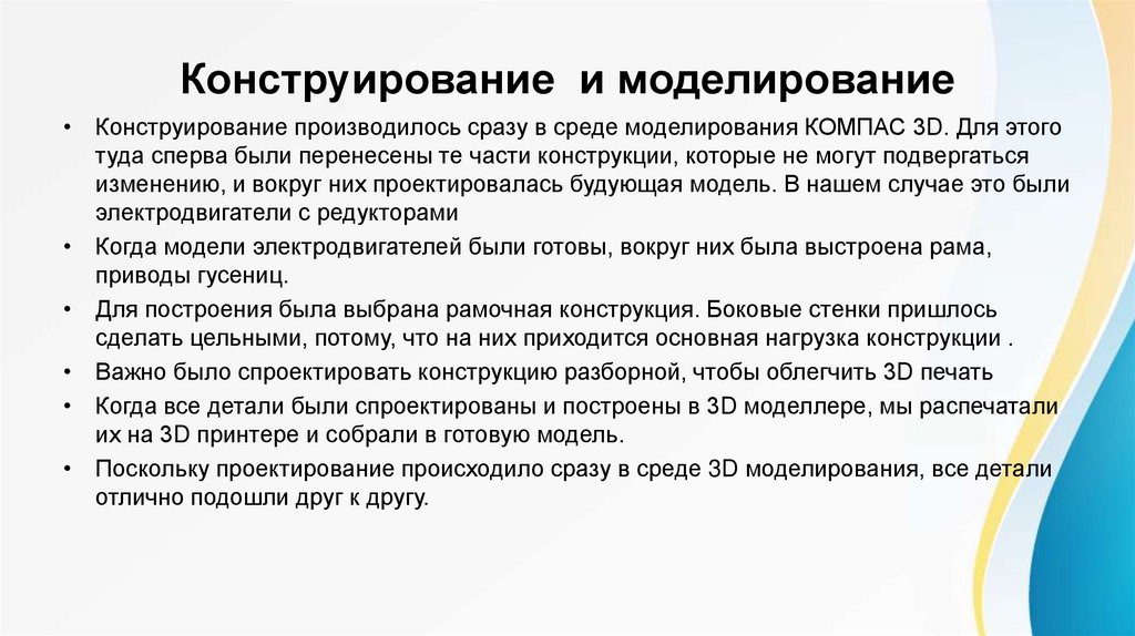 Конструирование и моделирование• Конструирование производилось сразу в среде моделирования КОМПАС 3D. Для этого