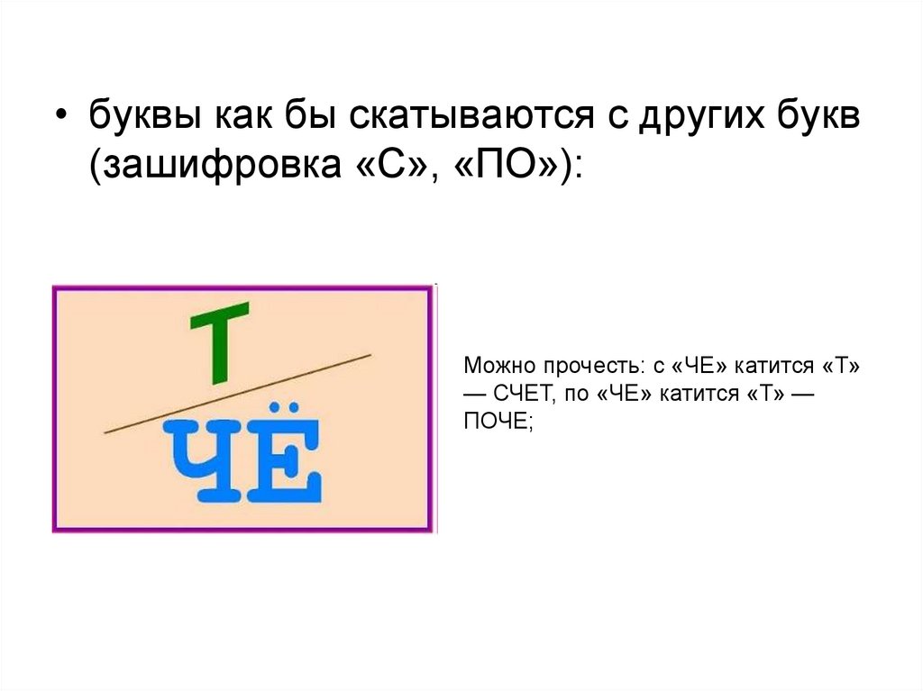 • буквы как бы скатываются с других букв(зашифровка «С», «ПО»):