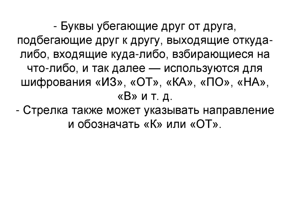 - Буквы убегающие друг от друга,подбегающие друг к другу, выходящие откудалибо, входящие куда-либо, взбирающиеся на