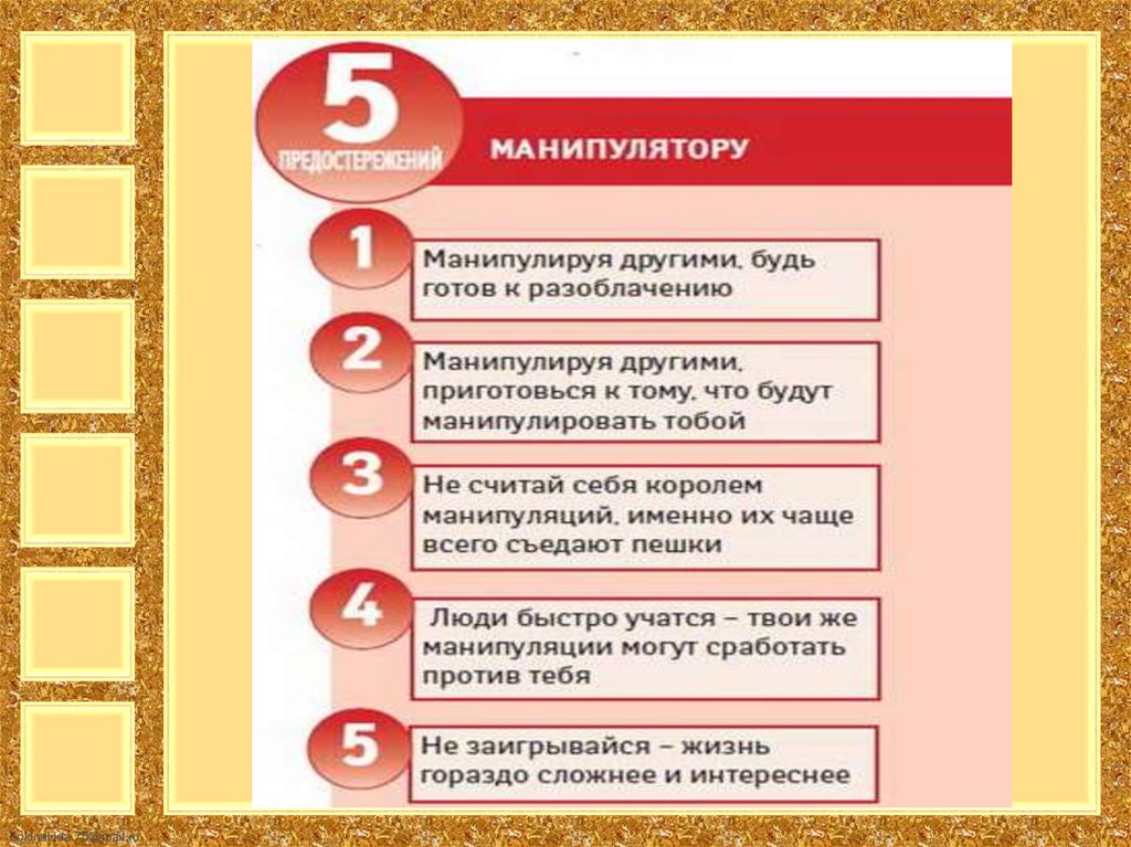 • Формула шантажа: «если ты не…, то я…».Такую манипуляцию довольно трудно